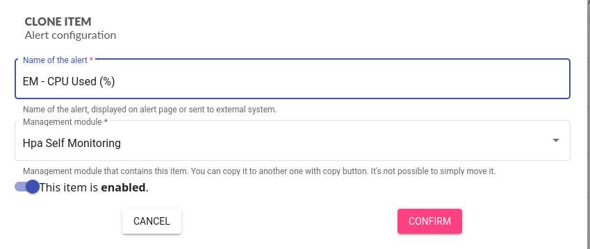 Clicking on opens copy and paste modal, allowing to create a new alert from an existing one, by entering: