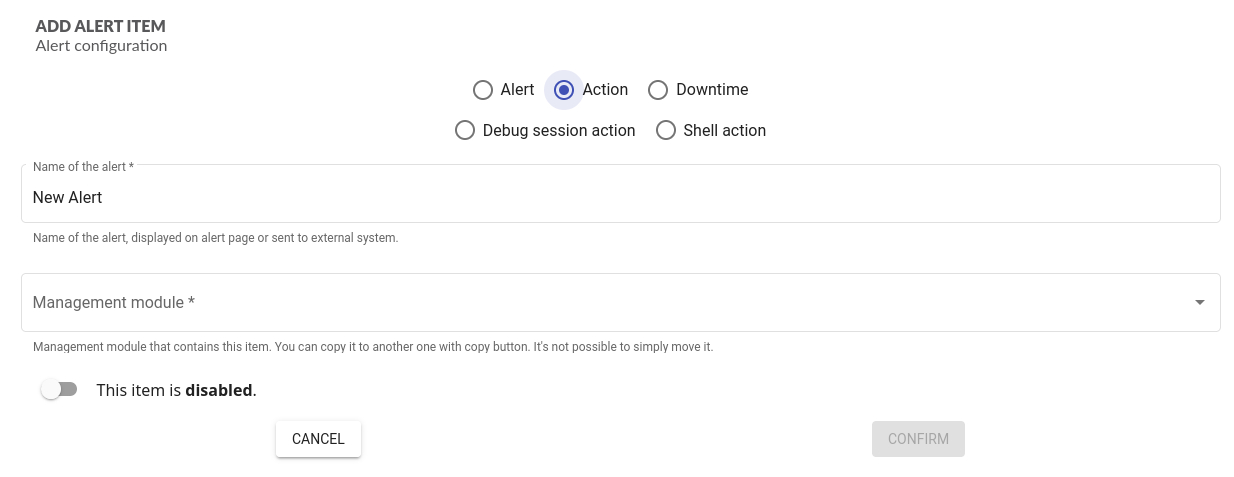 Clicking on , an alert, alert action or downtime can be created, by entering: