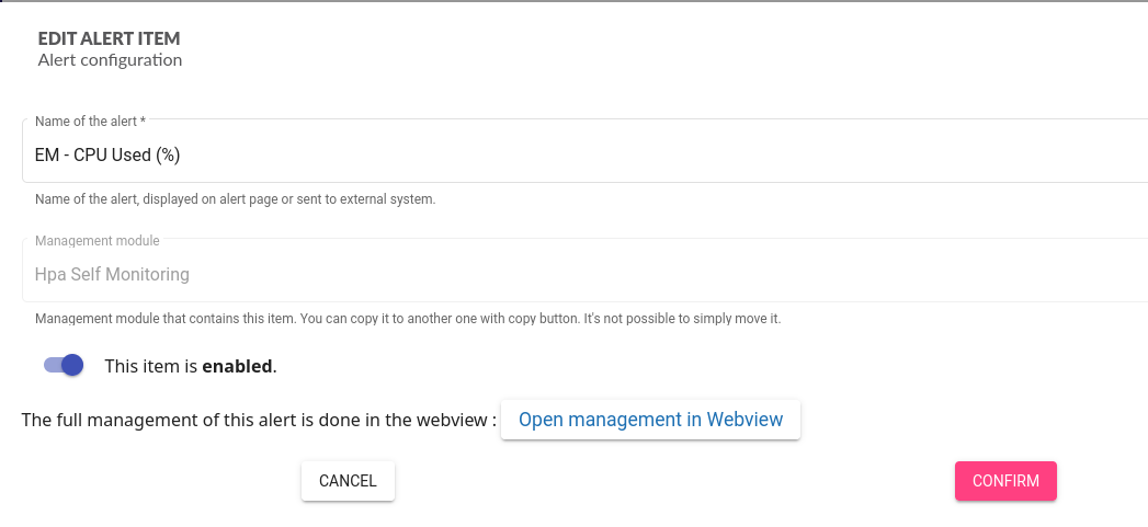 Clicking on opens edition modal, allowing to edit the name of the alert and whether it’s active or not.
