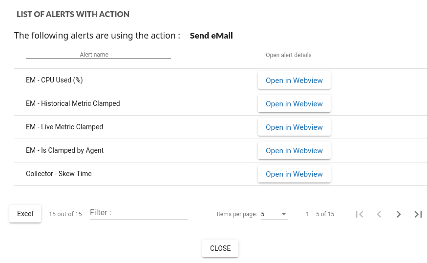 For “Action” type only, clicking on opens a modal displaying all the alerts configured with this actions.